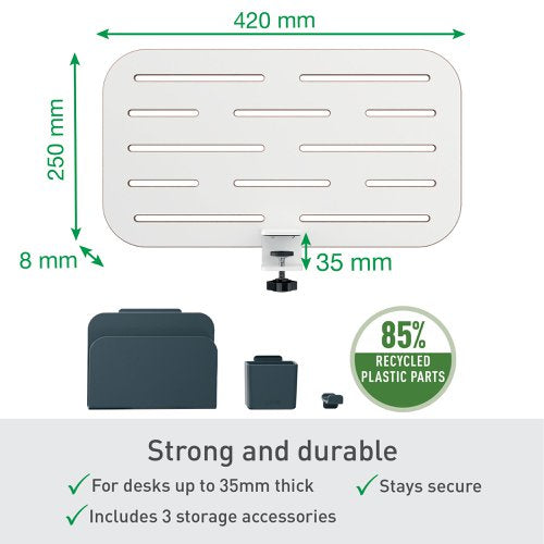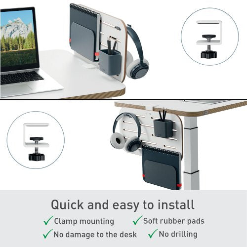 Keep your desk tidy and make the most of the space available with the Leitz Ergo Pegboard Desk Organiser. These unique vertical desk organisers are easy to mount on top or underneath a desk or table and create instant storage for everything from headsets to notepads and pens. Keep all your essentials organised, easy to find and free up valuable desk space. Simply position the strong 85% recycled plastic storage accessories provided (1 x note pad holder, 1 x pen holder and 1 hanging hook for a headset) onto the pegboard to create your own personalised workspace. Engineered in Germany and compatible with most desks with a maximum table top thickness of 35 mm, the pegboard organiser is easy to install and a valuable addition to the Leitz Ergo Sit Standing Desks (65340001 or 65360001). The pegboard is made from durable 8mm MDF to ensure strength and stability and soft rubber pads protect the desk surface from scratches. This modern and minimalist pegboard organiser is ideal for your home or office to enhance comfort and maximise productivity. It's our mission to provide solutions that can empower individuals to thrive at work and beyond promoting positive mental health and physical wellness. Combine with many other Leitz Ergo products to customise your flexible and individual sit, stand & move workstation. Stay active and FEEL GOOD with Leitz.