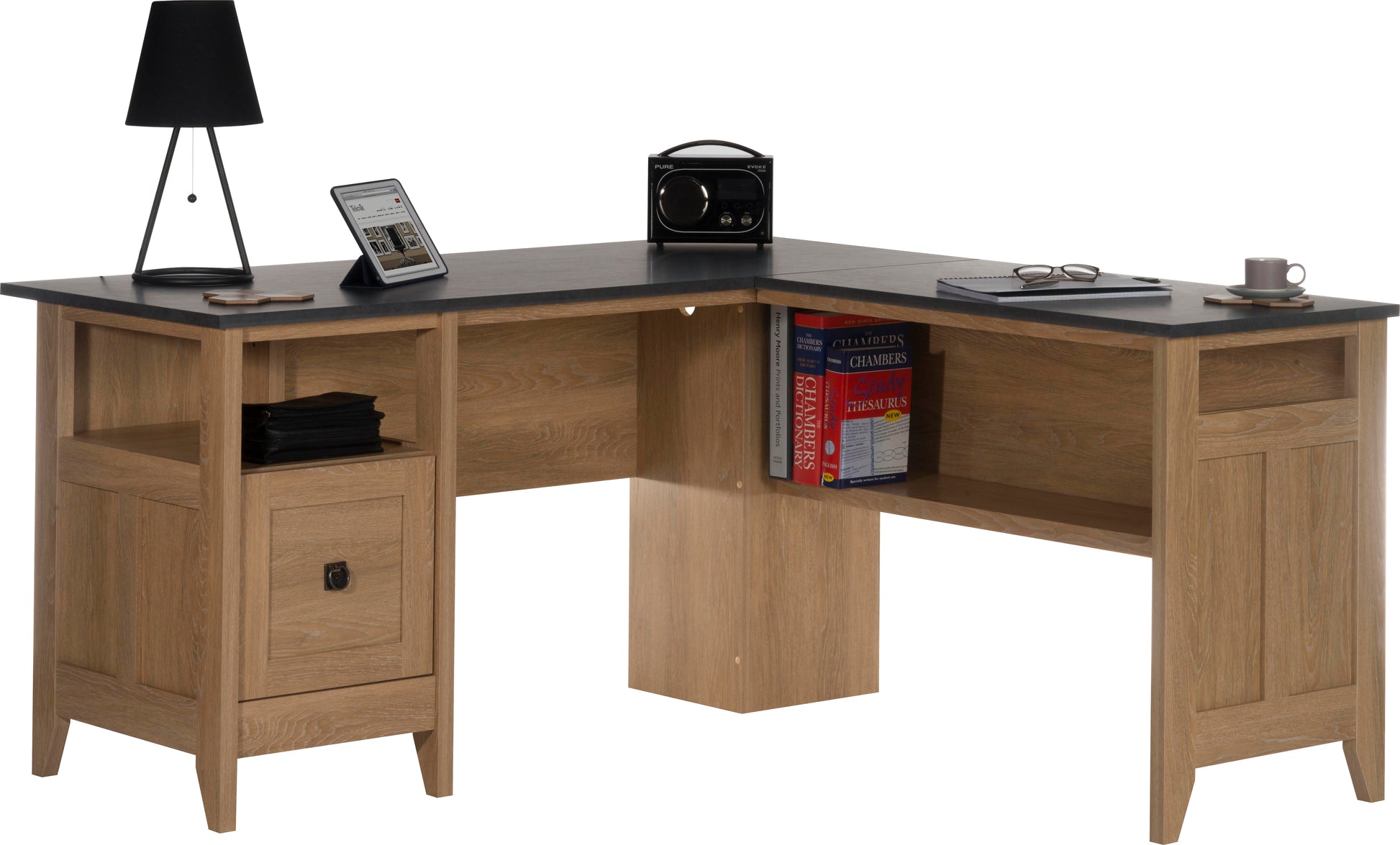 Teknik Office L-Shaped Executive Desk with Dover oak finish and stylish slate coloured desktop.Delivery in: