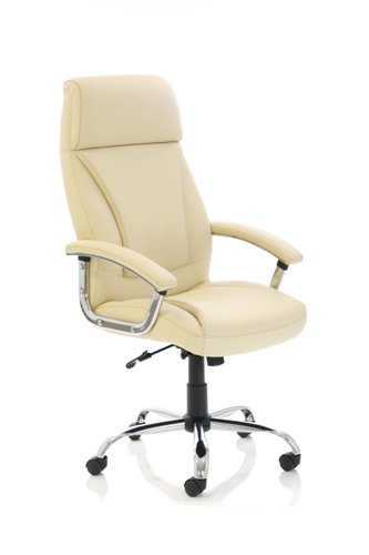 A luxurious leather and chrome executive chair with comfort pads, tilting action and stylish stitching detail. Padded headrest